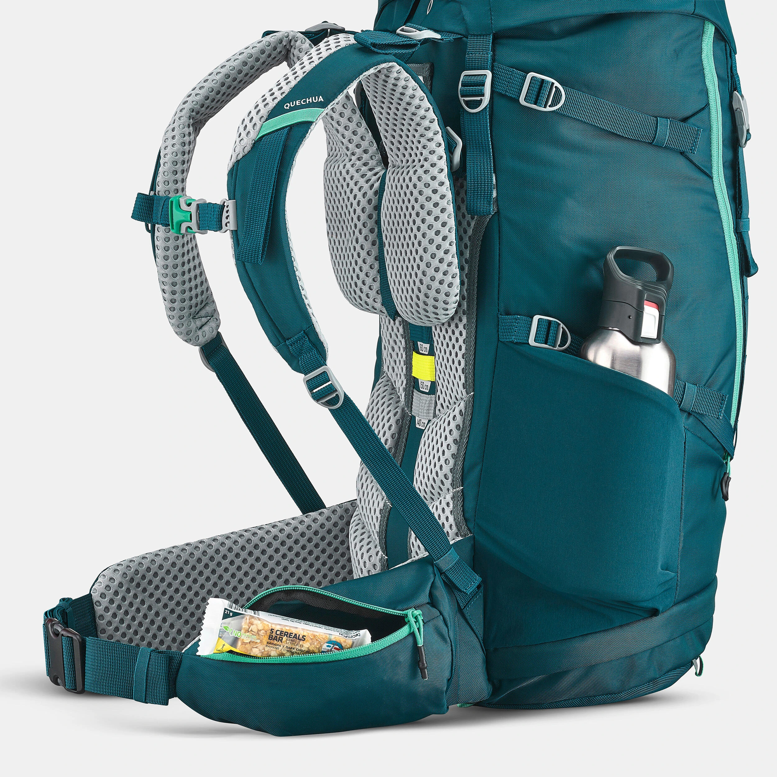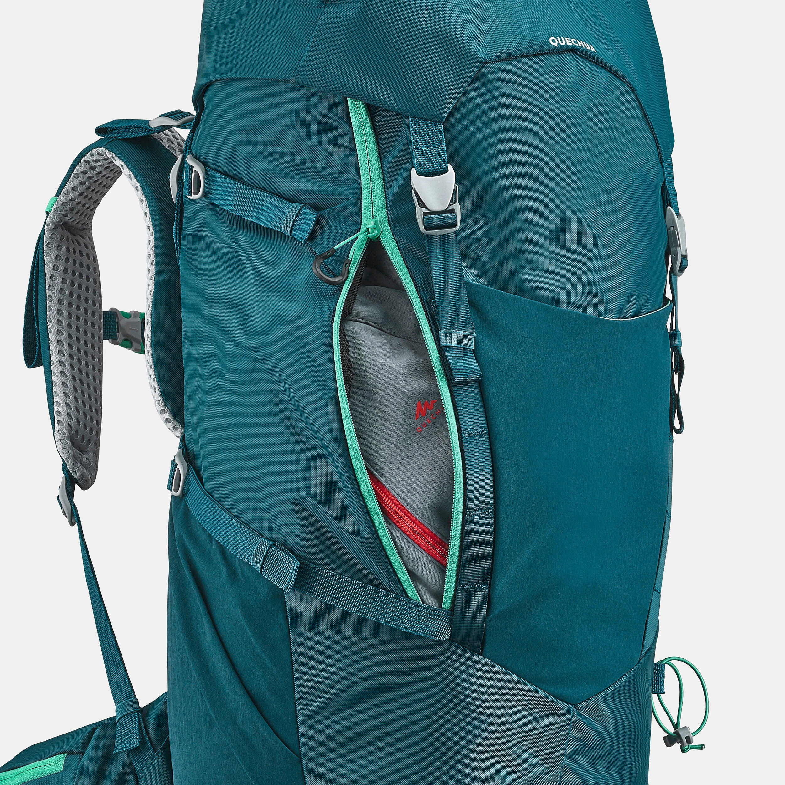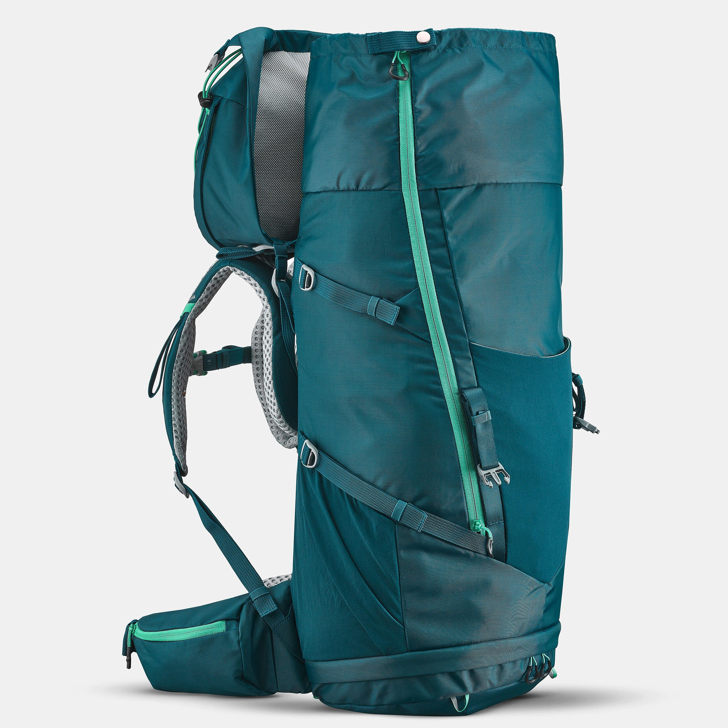 This hiking backpack adapts to your child’s body shape. Ideal for several days of adventures, with a capacity of 40 L + 10 L (9 gal + 2 gal). We integrated some practical storage areas and a side opening for easy access to the contents.
